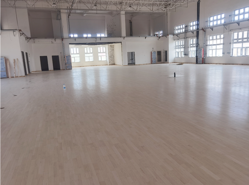 場館采用楓木A級地板,相對于外觀相近的楓樺木硬度更高,結合底層LVL雙龍骨結構系統,可以進一步增加球體的回彈性,提高減震緩沖性能,避免運動員落地時受地面反作用造成傷害,減少受傷的比例。 同時,900平米的場館全部采用原木色地板,白色畫線,一眼望去,木材的紋路清晰可見,更能突出場館簡約莊重。