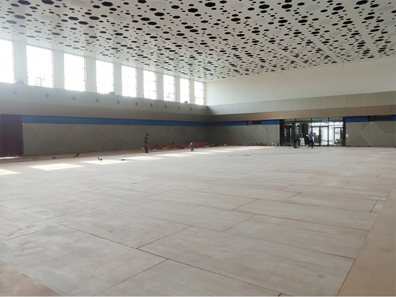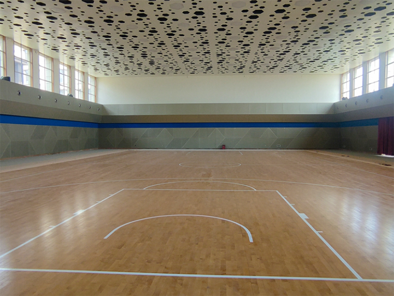 場館共700平米,采用宏憲SPTFL05運動木地板系統,整體結構穩定性強;擁有更好的沖擊吸收率和通風性能;20mm厚窩蜂形紅色天然橡膠減震墊,相對于其他膠墊厚度較高,減震緩沖性能更好。面板進行加黃調色處理,顏色偏深更貼近比賽場館,視覺效果更佳。外觀上采用星空形的吸音房頂加黃的較高等級的面板再加上場館左右窗戶灑下的陽光更突出球館的夢幻和高端。