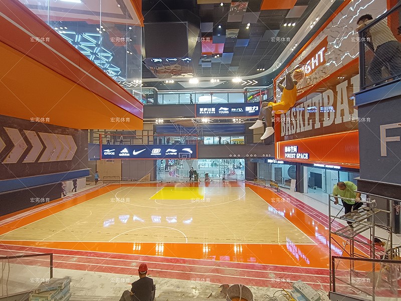 場地共400平米,雖然是一個半場,但是它的設計風格不亞于大型的體育場地,吾悅廣場整體以“”潮涌石澗、光照海岸“”作為意向,打造多層觀景退臺,營造開闊的視野。作為內部亮點之一的籃球館一定會迎來更多的駐足。該場館木地板采用現場上漆的工藝,以黃、橙、紅三種顏色來搭配,不僅與整體商場色調風格呼應,而且幾種顏色形成鮮明對比,更突出場館的活力與朝氣。場地對運動性能的要求也很高,采用宏憲SPTFL01結構,雙層減震膠墊,使打球的回彈性更高,減震吸收能力更好,而且層層結構都具有國家標準的檢測報告,使場地使用起來更加有保障。